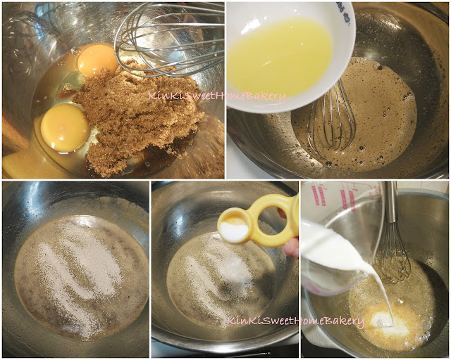 3. 加入豬牛油溶液、酵母、梳打粉、牛奶攪拌均勻