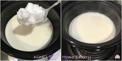 1. 牛奶160g與上白糖混合,用小火煮沸